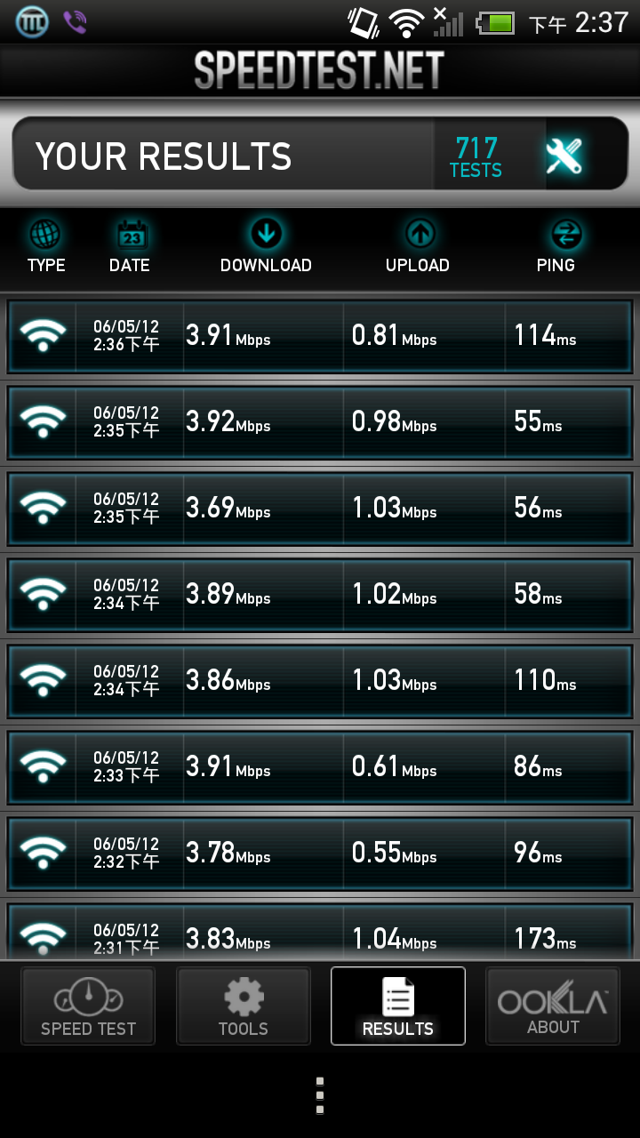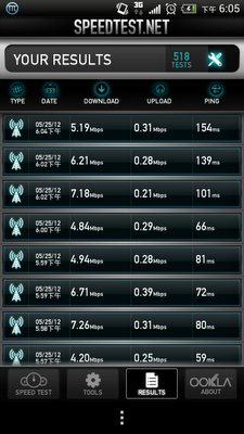 首先呢,測試方式很簡單,就是直接連續測量八次。3G就是直接用手機的3G,WiMax則是用大力玩所分享的WiFi來測試。本來想要手動計算平均速率,不過因為資料太多了...所以只有抓個估計值。如果差距太大,就會抓個範圍。如果去掉最高和最低後,剩下資料差距不大,就會目測抓個平均值。